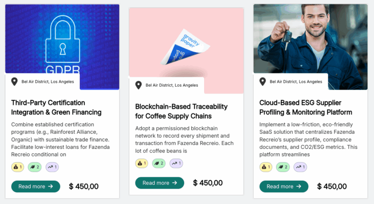 Open a tile to see case studies, credible data (e.g., satellite or scientific sources), product/vendor links, supplier contacts, and one‑click steps to move forward.